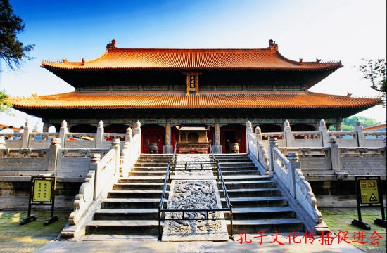 大成殿是孔庙的核心建筑,是祭祀孔子的中心场所。原名为文宣王殿,始建于宋天禧二年(1018)。“大成”二字出自《孟子》“孔子之谓集大成”句,“大成殿”之名始于宋崇宁三年(1104),宋徽宗赵佶赐名“大成殿”, 赞颂孔子思想空前绝后,完美不缺,集古圣贤之大成,并亲书匾额,北宋末年毁于战火。金代皇统九年(1149)重建,明昌五年(1194)重修时扩为七间,绿色琉璃瓦,廊柱也改为石质,并刻龙为饰。贞佑二年(1214)又毁于战火,元大德六年(1302)又重建。明成化十六年(1480)扩为九间。到明弘治十二年(1499)又毁于雷火,旋即重建。清雍正二年(1724)复遭雷火,也正是从这次重建时皇帝恩准殿顶采用黄色琉璃瓦,与皇宫的规格等同起来。